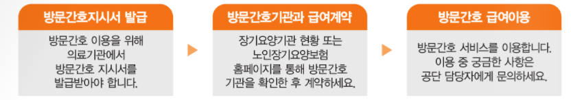 ⇒ 방문간호는 방문간호지시서에 따라 간호(조무)사 또는 치과위생사가 수급자의 가정 등을 방문하여 간호 및 처치, 교육, 상담, 구강위생 등을 제공하는 것을 말합니다. ⇒ 방문간호를 신청하기 전에 의료기관에서 방문간호지시서를 먼저 발급받으셔야 합니다.